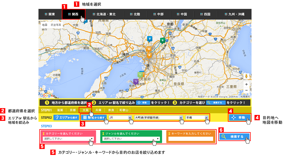 アイコンの中の数字は、それぞれの並び順であり、地図の中の番号に対して店舗一覧の番号が対応しています。